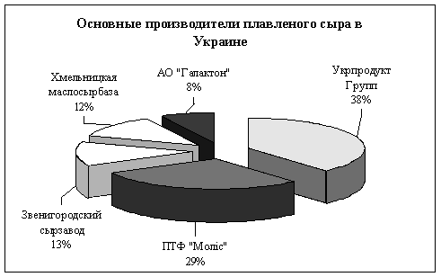 Основные производители. В секторе плавленых сыров 5 предприятий контролируют более половины национального производства. На прочие же два десятка компаний (среди которых и крупные по твердым сырам, например, Пирятинский или Шосткинский комбинаты) приходится лишь 41,07% национального производства. Лидером здесь выступает объединение двух сыр- и одного маслодельного завода «Укрпродукт Групп» с долей 38% и торговыми марками «Наш молочник» и «Народный продукт». Обладатель второго места компания ПТФ «Молiс» с одноименной торговой маркой объединяет усилия трех сырзаводов, благодаря чему контролирует 29% национального производства. «Звенигородский сырзавод» (ТМ «Звенигора») обладает 13% плавленого сыроделия страны. «Хмельницкая маслосырбаза» – это не только марка «Вершковий рай», но и 12% национального производства плавленых сыров. Замыкает пятерку крупнейших украинский член российской «Планеты Менеджмент» АО «Галактон» со своей маркой и 8%-й долей рынка.