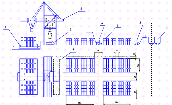 Рисунок 1. Проектируемая технологическая схема механизации с использованием мостового перегружателя. 1-зона перевозки контейнеров, 2-мостовой перегружатель, 3-ролл-трейлер, 4-судно,5-склад КК, 6-ричстракер, 7-ж/д вагоны
