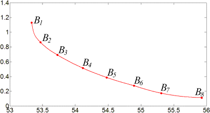 Рис. 1. Кривая точек неулучшаемых значений целевых функций при соответствующих оптимальных стратегиях ремонта и замены оборудования