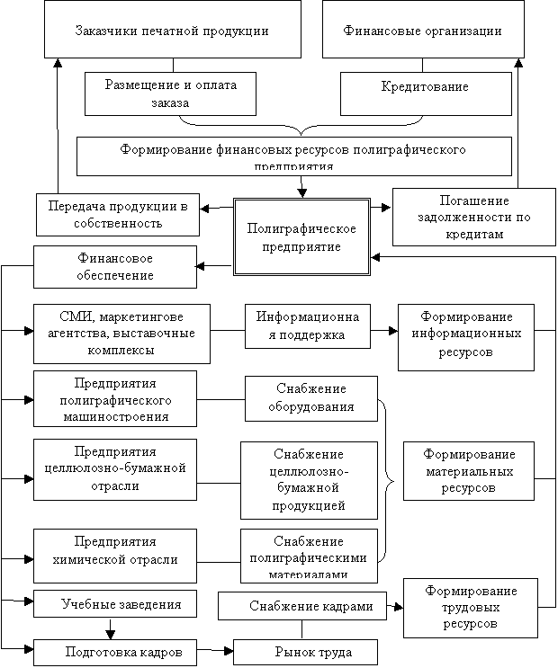 В свою очередь, полиграфическое предприятие формирует ресурсы субъектов внешней среды. В частности, осуществляется финансовое обеспечение деятельности поставщиков, а также передача заказчику в собственность готовой печатной продукции. Готовая печатная продукция становится ресурсом заказчика, если выполняет рекламную функцию.