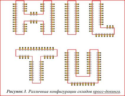Отдельно стоит отметить стехнологические различия складских зданий при кросс-докинге и традиционном складе. Главное отличие сзаключается в том, что при организации кросс-докинга необходимо стремиться к наибольшей длине здания для размещения большего числа воротных доков, а в случае традиционного склада – к большей площади склада для обеспечения его максимальной свместимости. Потребность в «длинных» складах для кросс-докинга приводит к необходимости строительства зданий различных конфигураций (H, I, L, T ,U-образных), таких, как сприведены на рисунке 3. Для определенного числа воротных доков выгоден конкретный тип здания (например, тип «I» оптимален при количестве ворот меньшем, чем 150, а тип «Н» – при наличии более 300 ворот).