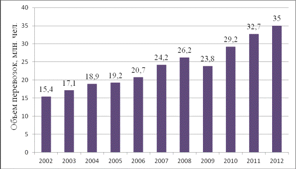 -->За последние 5 лет российский рынок авиаперевозок увеличился в полтора раза, показывая высокие среднегодовые темпы роста. По итогам 2011 года российские авиакомпании перевезли 32,7 миллиона человек, что на 12% больше, чем в 2010 году. В 2012 году перевозки увеличились на 7% - до 35 миллионов человек (рис. 1).