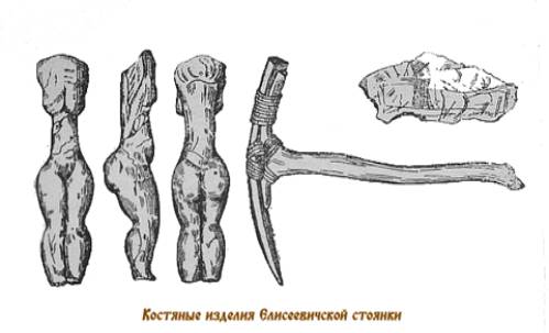Кремнёвые орудия труда и охоты (ручные рубильца, скрёбла, остроконечники, резцы, наконечники копий), используемые для разделки туш животных, разрезания, выскребания, прокалывания и сшивания их шкур, раскалывания, резания и сверления костей. Но, несмотря на суровые условия климата, население края намного увеличилось. Об этом свидетельствуют верхнепалеолитические стоянки. Их на территории области открыто восемь. Наиболее интересные находятся в д. Елисеевичи и в с. Юдиново на р. Судости, в с. Супонево и пос. Тимоновка под Брянском. Во время раскопок на них обнаружены остатки больших жилищ. На Елиееевичекой и Юдиновской стоянках они были наземными. Основания помещений выкладывались из крупных костей мамонтов. На Тимоновской стоянке жилища представляли большие прямоугольные землянки.