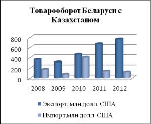 Рисунок – Товарооборот Беларуси с Россией и Казахстаном за 2008-2012 гг., млн. долл. США