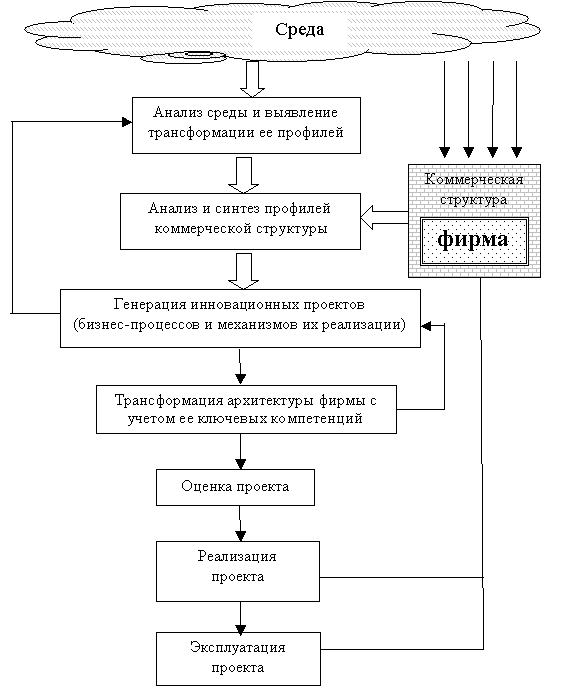 Графическая модель механизма адаптации архитектуры коммерческой структуры представлена на рис.1. Элементами этого механизма являются профили среды, комплексный профиль коммерческой структуры, итерационная генерация инновационных бизнес-процессов и реализующих их механизмов.