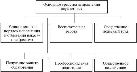 В соответствии с ч. 2 ст. 9 Уголовно-исполнительного кодекса РФ к основным средствам исправления относятся: 1) установленный порядок исполнения и отбывания наказания (режим); 2) воспитательная работа; 3) общественно полезный труд; 4) получение общего образования; 5) профессиональная подготовка; 6) общественное воздействие (рис. 5).
