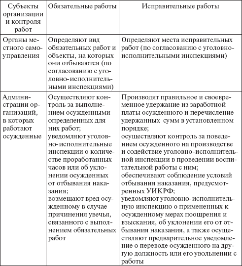 Таким образом, поправки, внесенные в УК РФ и УИК РФ Федеральными законами от 8 декабря 2003 г. № 161-ФЗ, № 162-ФЗ, существенным образом изменили правовую природу уголовных наказаний в виде обязательных и исправительных работ. Главным содержанием этих наказаний становится труд осужденных на благо общества, в этой связи важное место в их исполнении отводится органам местного самоуправления и администрациям подведомственных им организаций и предприятий. Обязательные работы заключаются в выполнении осужденным в свободное от основной работы или учебы время бесплатных общественно полезных работ. Вид обязательных работ и объекты, на которых они отбываются, определяются органами местного самоуправления по согласованию с уголовно-исполнительными инспекциями. Перечень видов и объектов обязательных работ устанавливается органами местного самоуправления с учетом общественных потребностей данного населенного пункта в благоустройстве территории, ремонтных, погрузочно-разгрузочных и других аналогичных работах. Исправительные работы применяются только к безработным осужденным, которые будут трудиться в местах, определяемых органом местного самоуправления по согласованию с уголовно-исполнительными инспекциями, но в районе места жительства осужденного. На практике исполнение обязательных и исправительных работ может столкнуться с проблемами организационного, социально-экономического, нравственно-этического характера.