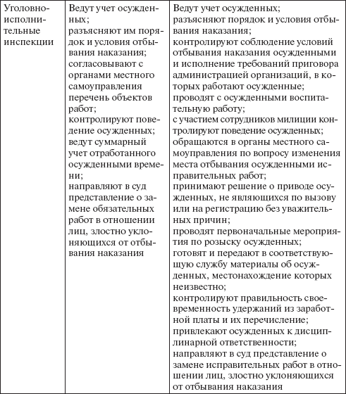 На уголовно-исполнительные инспекции в соответствии с ч. 3 ст. 39 Уголовно-исполнительного кодекса РФ и Инструкцией о порядке исполнения наказаний и мер уголовно-правового характера без изоляции от общества, утвержденной приказом Минюста России от 12 апреля 2005 г. № 38 возложены различные обязанности (см. табл. 4).